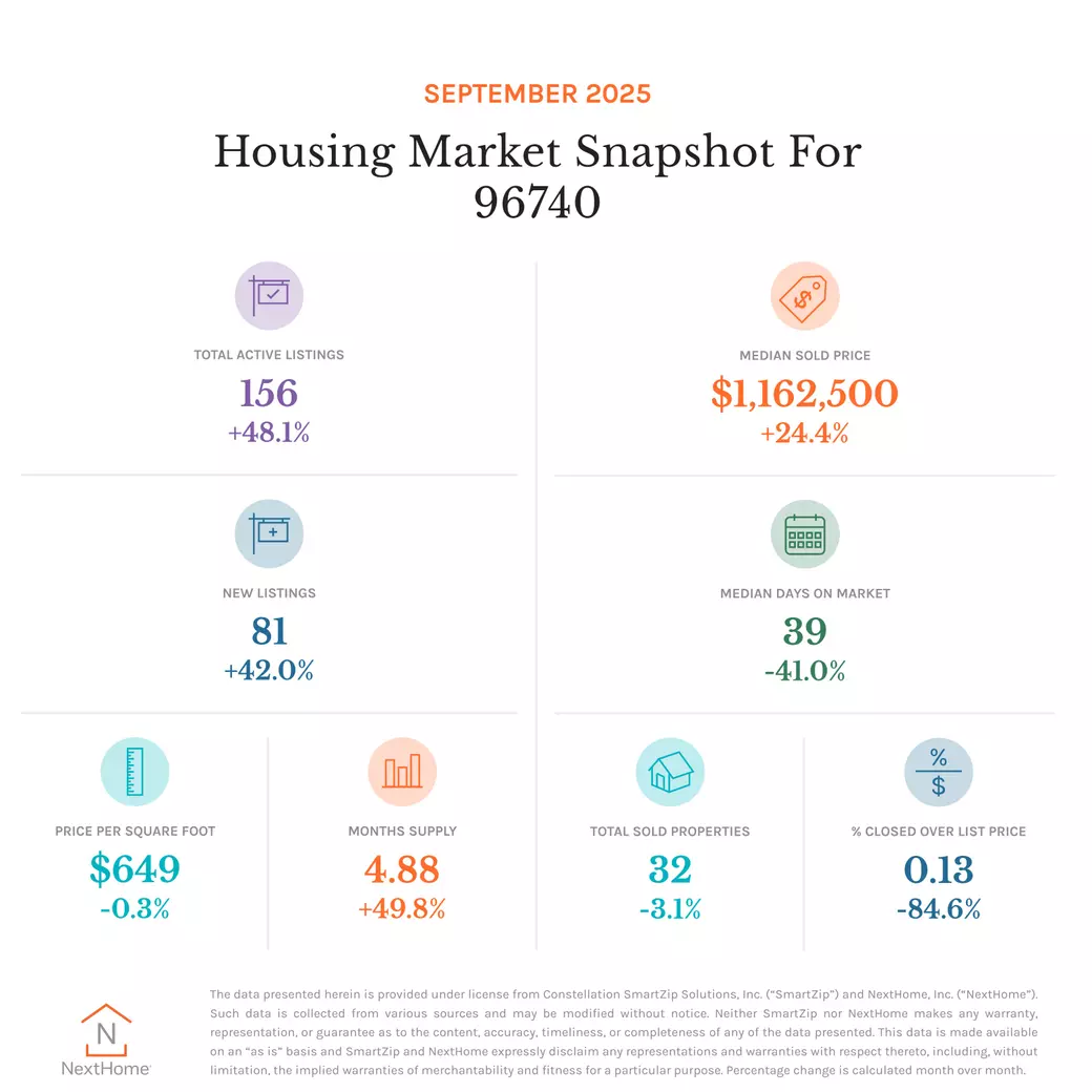 The Kailua-Kona housing market (ZIP 96740) saw a significant uptick in activity this September. Inventory is up nearly 50% month-over-month, while median prices remain strong, signaling a more balanced but still competitive market.